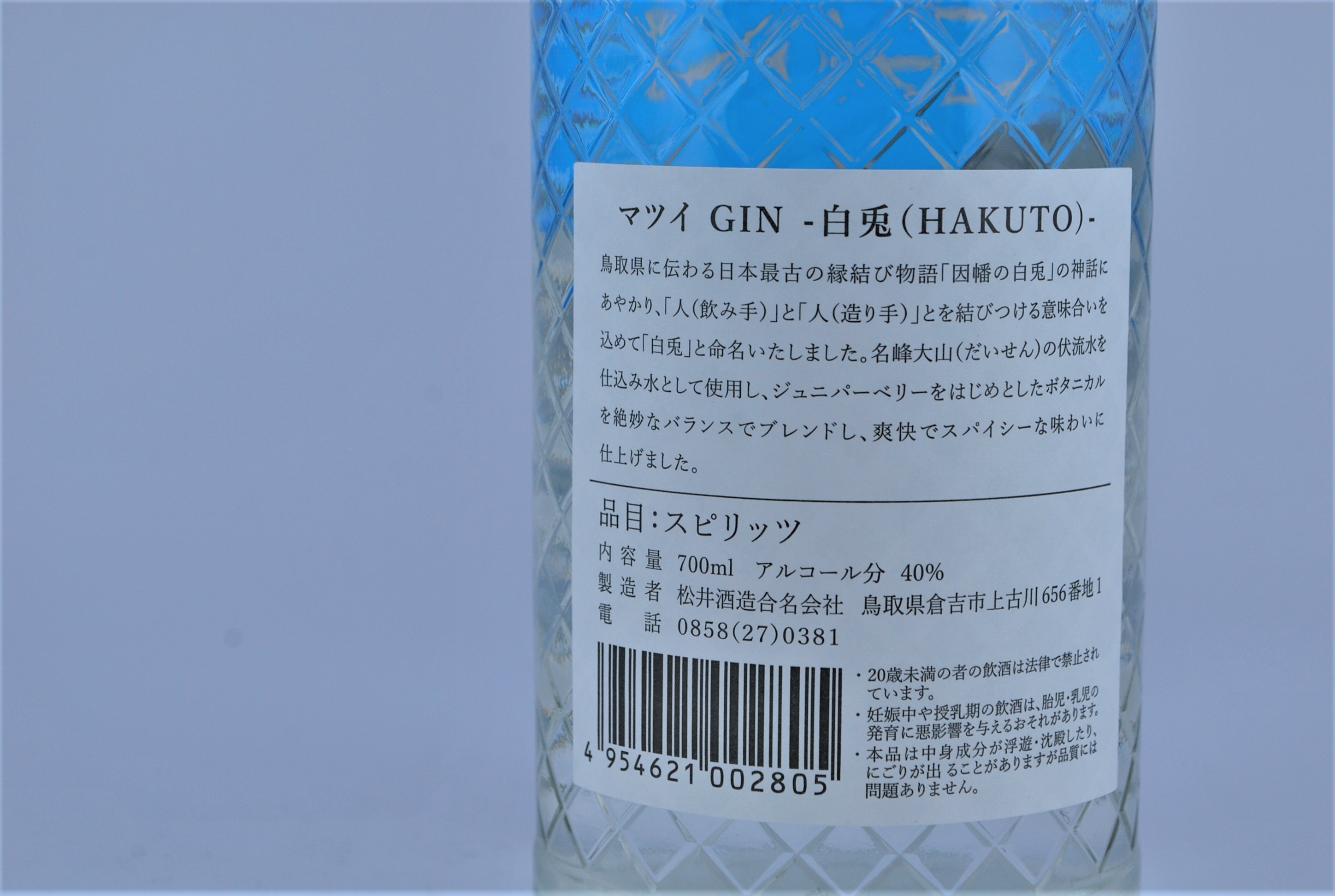 商品名 マツイ・JIN 白兎 本社 鳥取県倉吉市 蒸溜所 鳥取県倉吉市 社名 松井酒造合名会社 アルコール度数 40度 品目 スピリッツ(ジン) 容量 700ml |